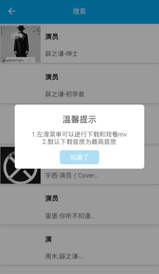 功能:免费下载/试听全网各大平台音乐/MV 向右滑动可下载音乐观看MV